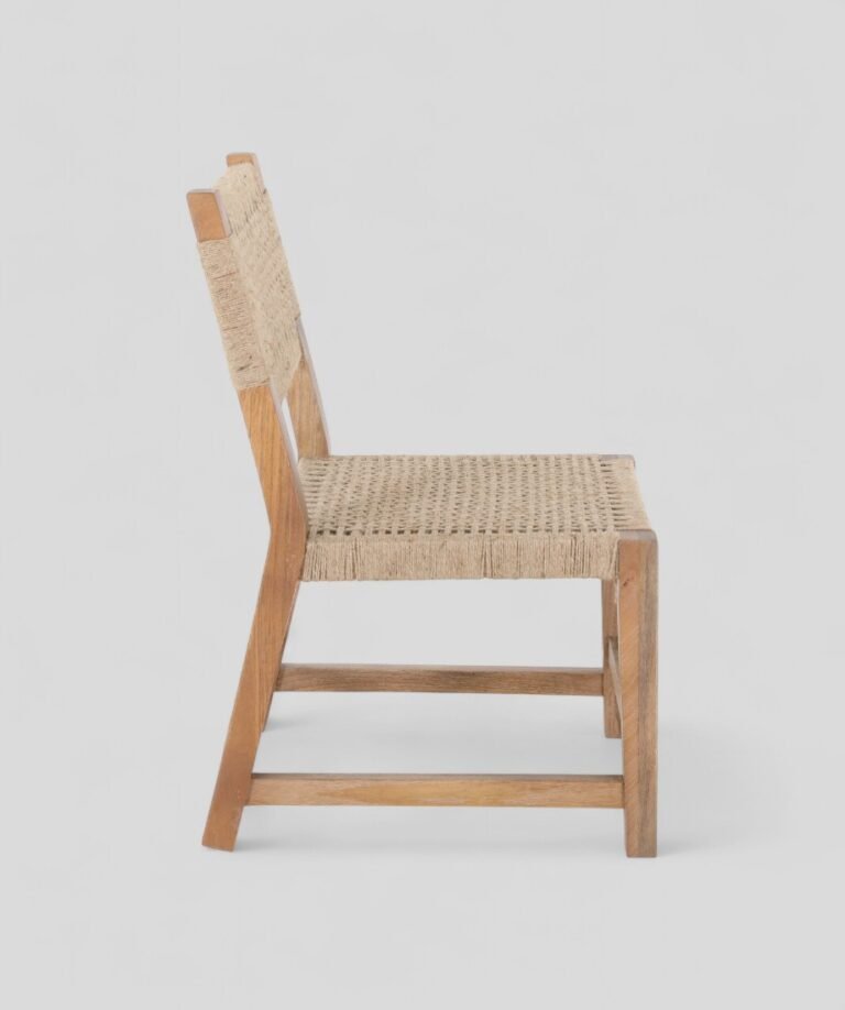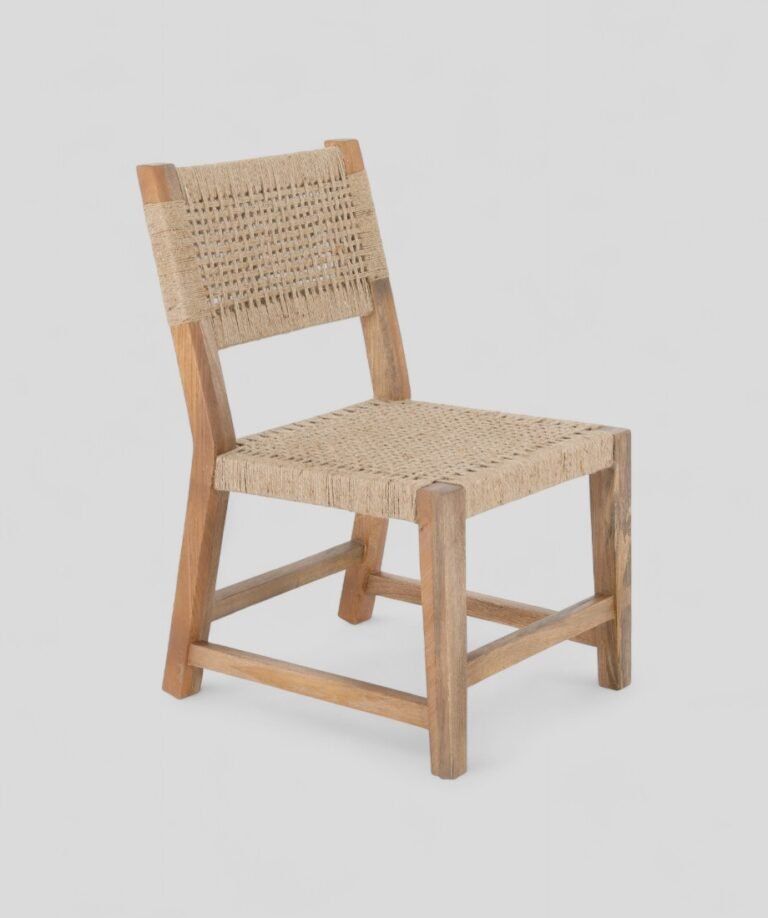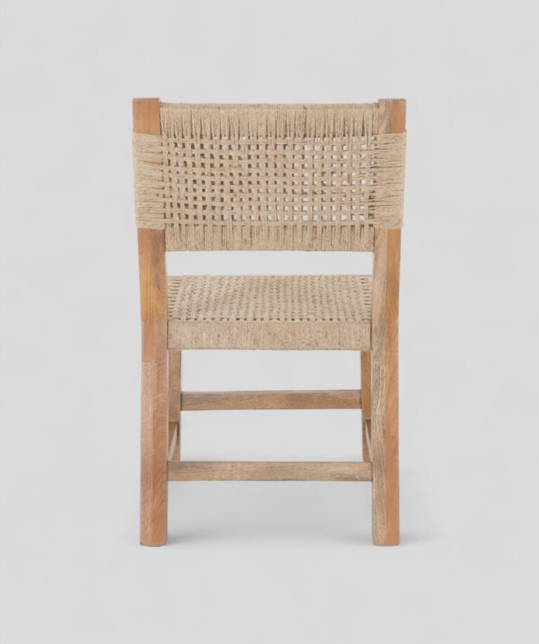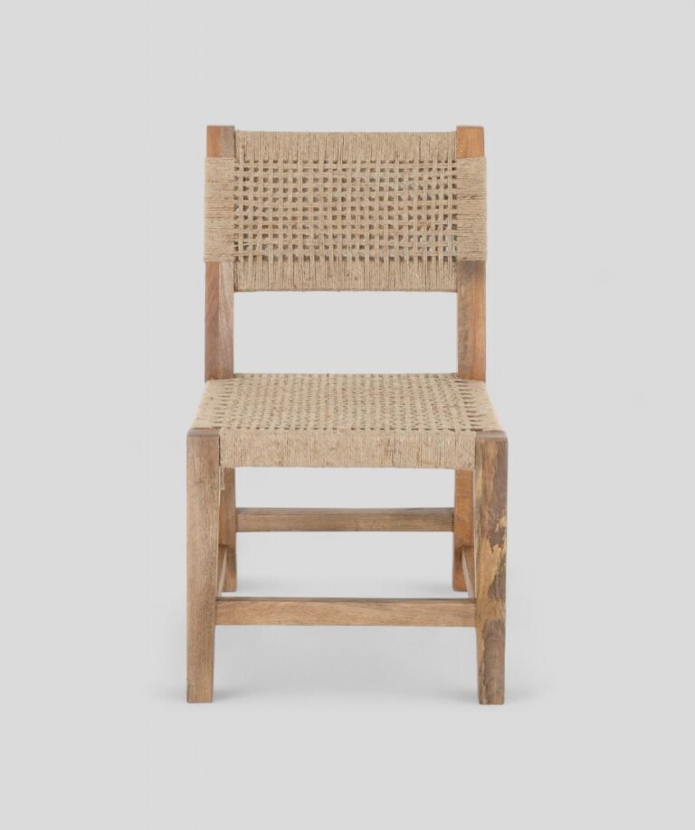 This eco-friendly chair combines a solid wooden frame with handwoven natural jute for a rustic yet elegant look. Durable and sustainable, it blends traditional craftsmanship with modern style. Perfect for dining or accent seating, it adds warmth and character to any space.