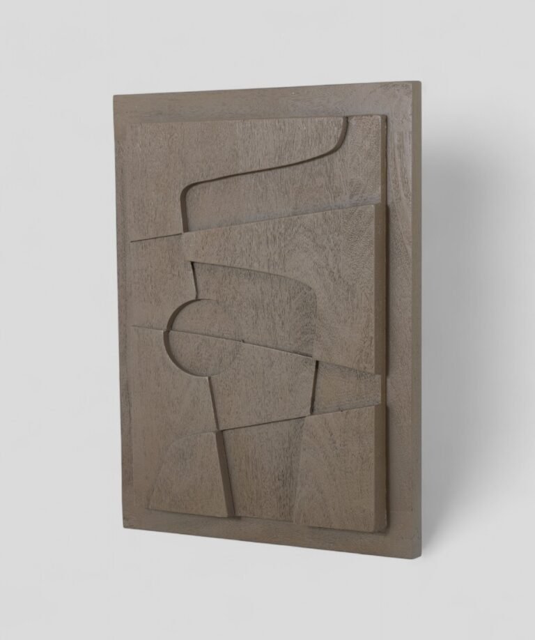 The artwork is characterized by an intricate relief design created through deeply incised lines that give the surface a striking three-dimensional quality. The entire carved section is thoughtfully enclosed by a raised, flat border of the same material, which acts as a self-contained frame. This minimalist framing technique elevates the artwork, giving it a polished and complete appearance. The piece’s elegant and earthy aesthetic makes it a versatile statement piece, capable of harmonizing with a wide range of interior decors, from minimalist and contemporary to more organic and natural styles.
