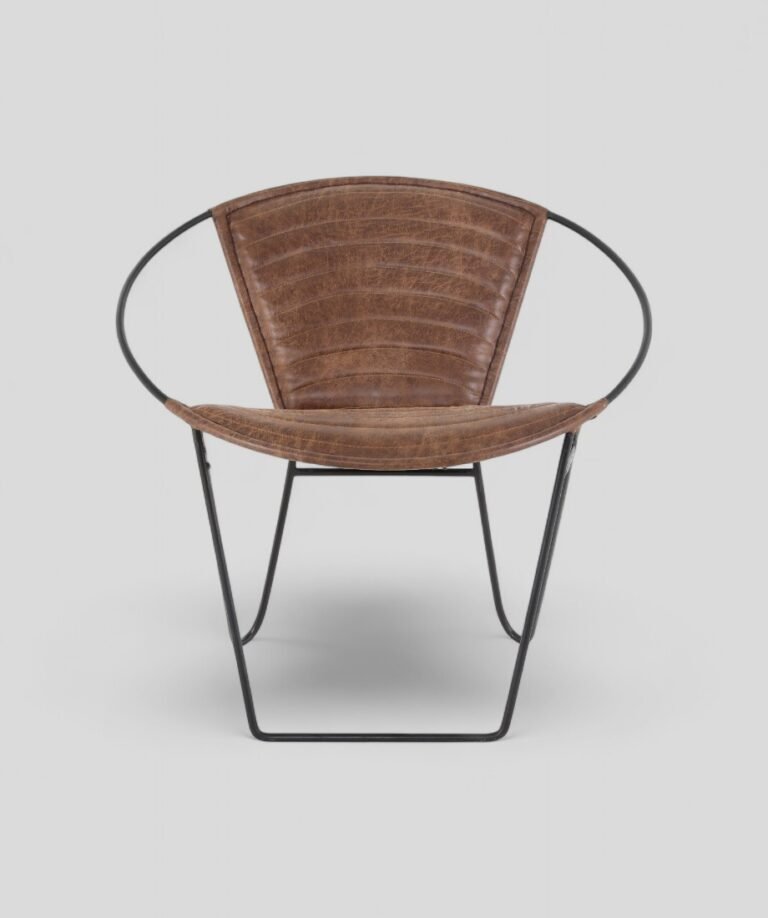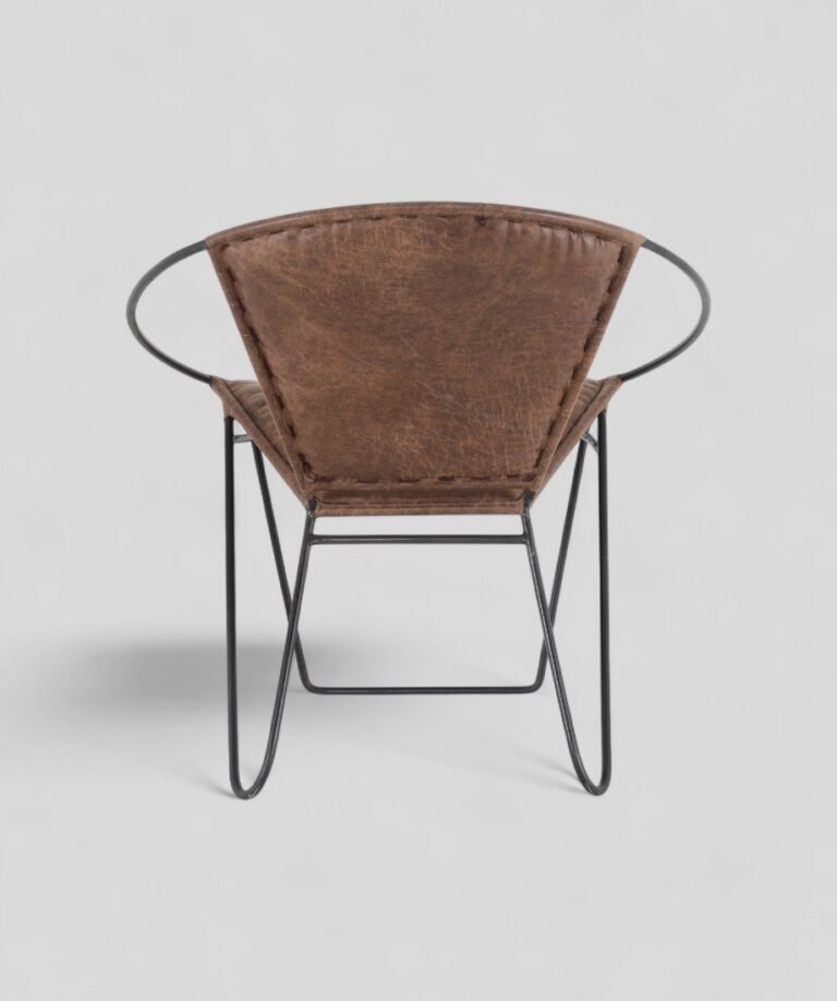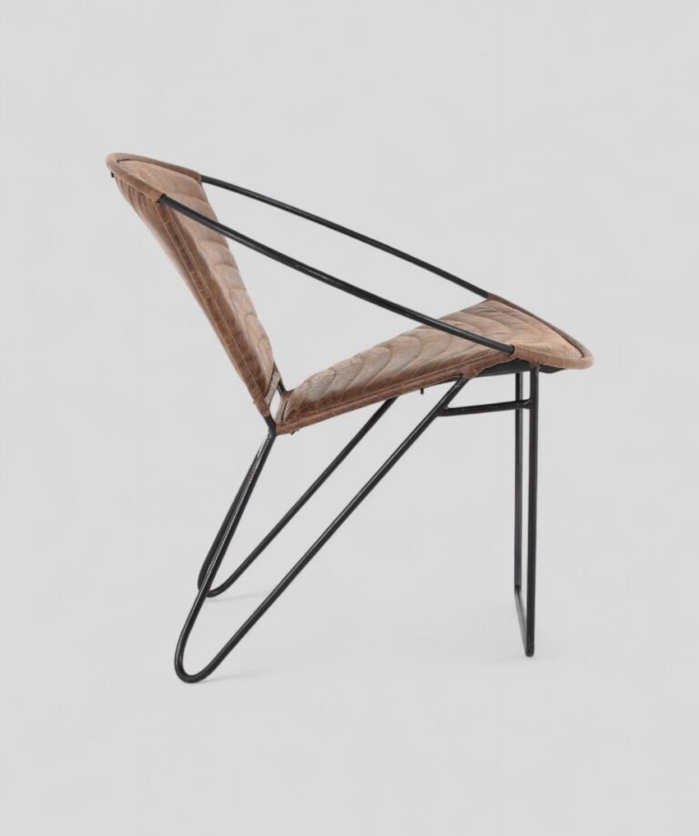 A minimalist geometric design, incorporating slim legs that angle outward and connect at the base for stability. The combination of industrial metal framework and warm leather upholstery creates a striking balance of ruggedness and elegance. The seat and backrest are padded for comfort, while the smooth leather finish adds sophistication.