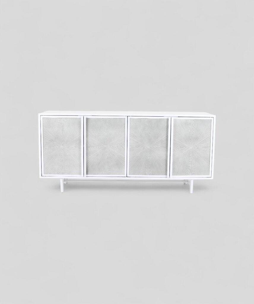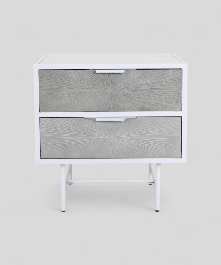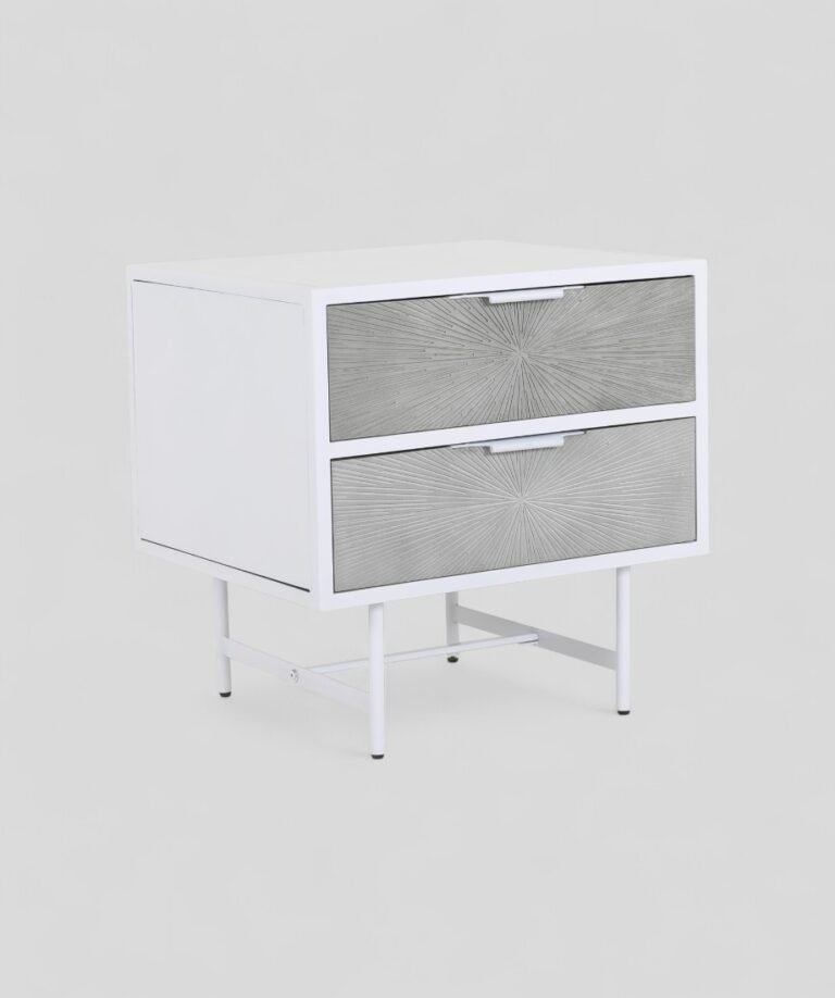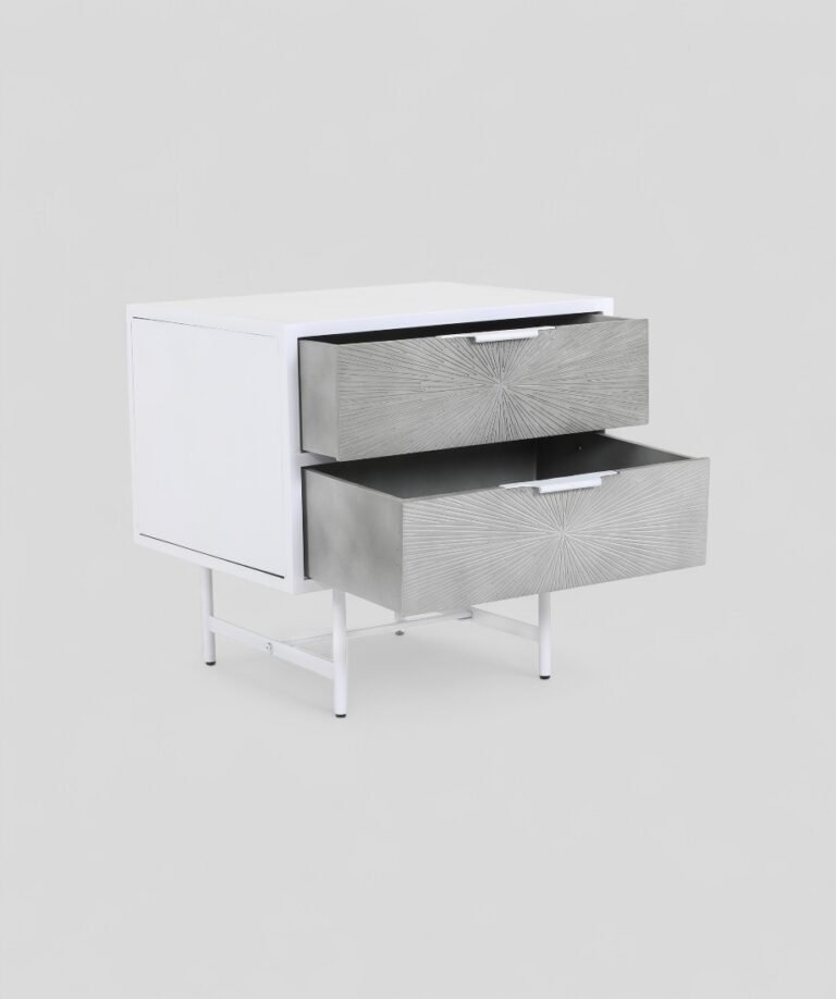 Elevate your bedroom with the Aura Bedside Table, a perfect fusion of minimalist design and timeless artistry. This piece captivates with its harmonious blend of materials and a stunning sun ray veneer that brings a warm, radiating energy to your space.