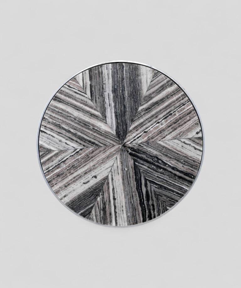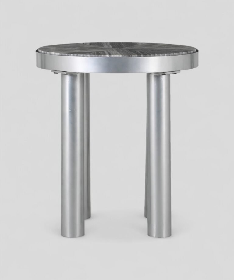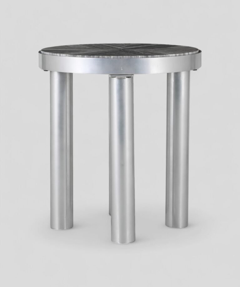 This side table doubles as both furniture and art. The circular surface is supported by five evenly spaced metallic columns, creating a sculptural form that is as eye-catching as it is practical. With its reflective silver finish and striking symmetry, it adds depth and character to interiors—perfect for those who appreciate furniture that makes a statement.