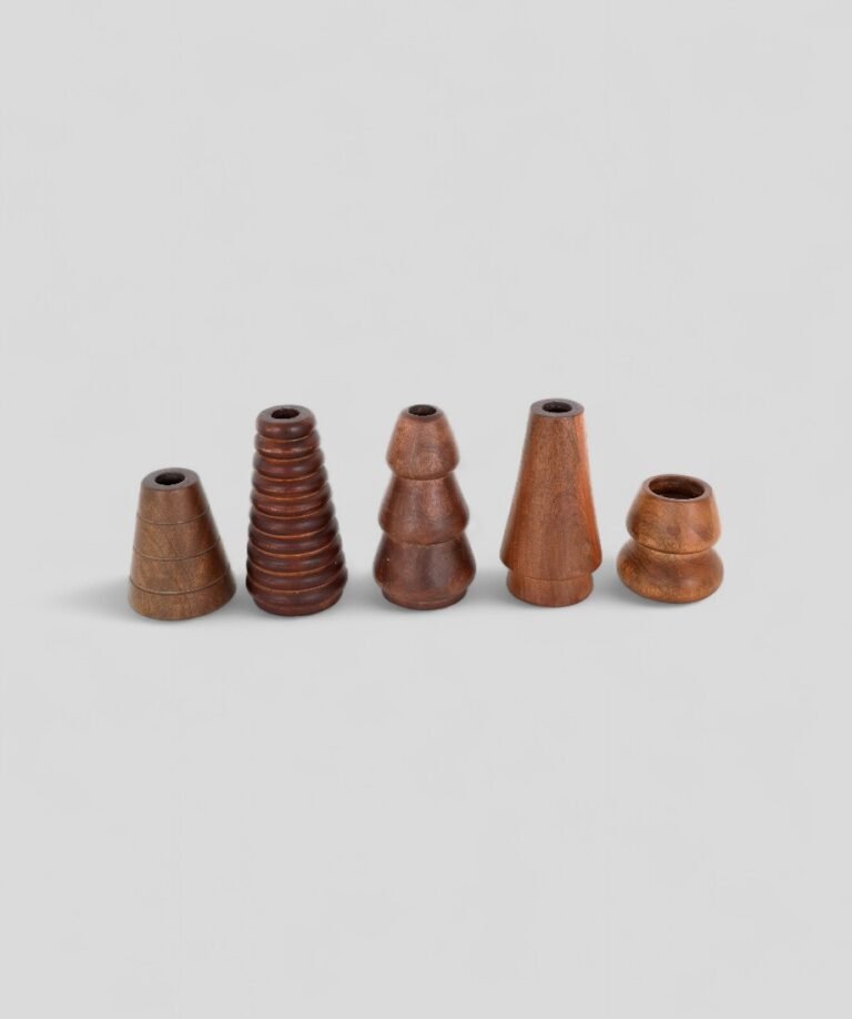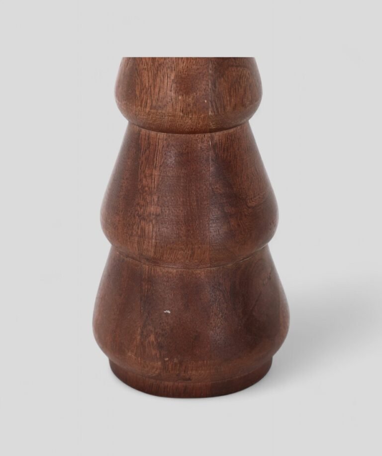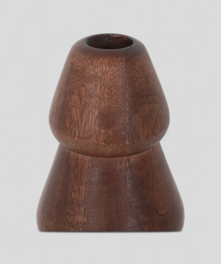 This wooden brown candle stand features a smooth, sculptural silhouette with a tiered, organic form that tapers elegantly toward the top. Crafted from richly grained wood, its warm brown finish highlights the natural beauty and texture of the material. The gentle curves and minimalist design make it a versatile accent piece, blending effortlessly with rustic, bohemian, or modern interiors.