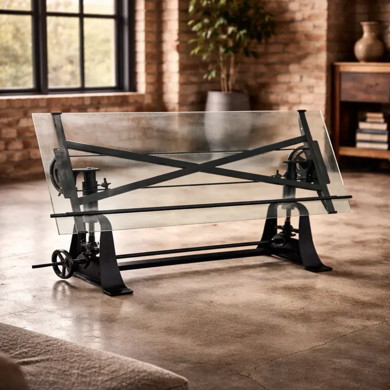 A statement-making drafting table designed with a clear tempered glass top and a robust iron structure. Its industrial-inspired frame features adjustable mechanisms for functionality, paired with an X-frame support for added strength and stability. The combination of transparent glass and black iron creates a bold, modern aesthetic appearance.