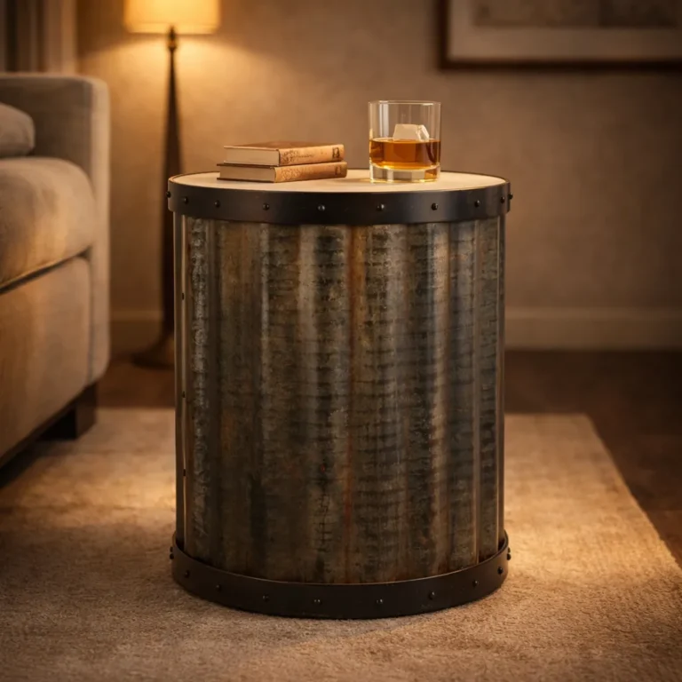 This rustic industrial side table brings a bold, vintage-inspired charm to any living space. Shaped like a barrel, the cylindrical base is constructed from corrugated metal with a naturally weathered finish, showcasing rich tones of aged steel and subtle rust accents. The distressed texture adds depth and character, making it a standout piece. Heavy-duty riveted metal bands frame the top and bottom, reinforcing the table’s raw, industrial appeal.