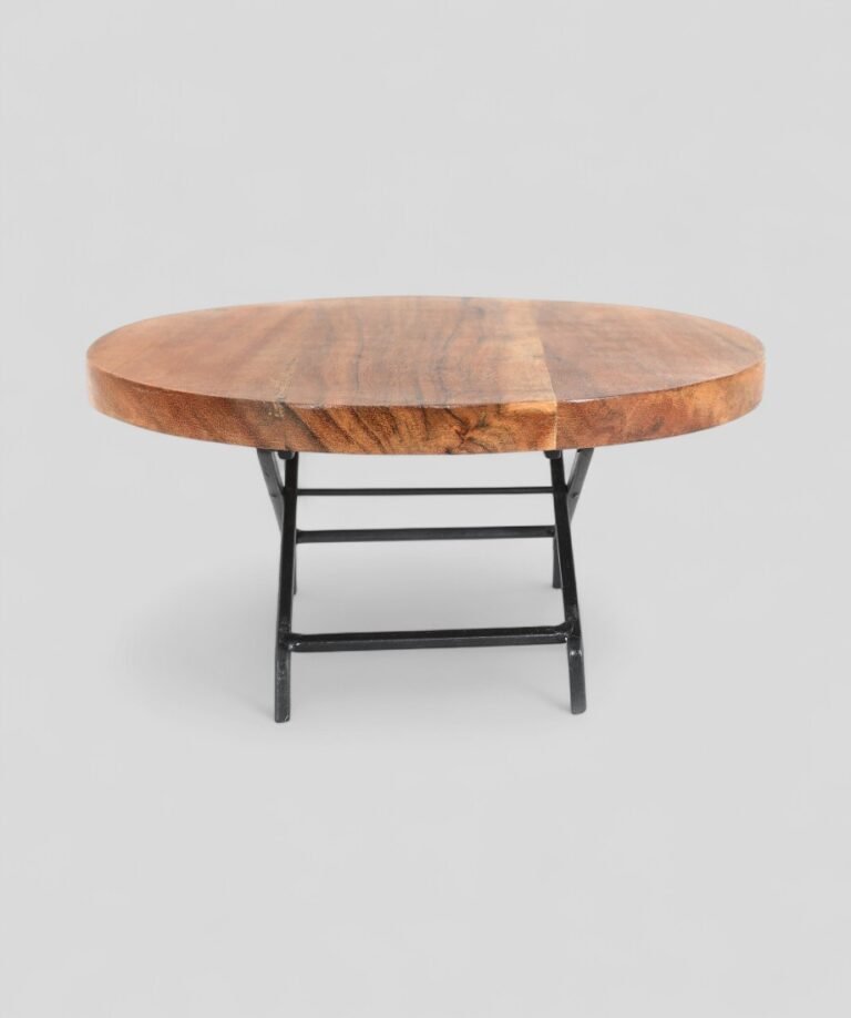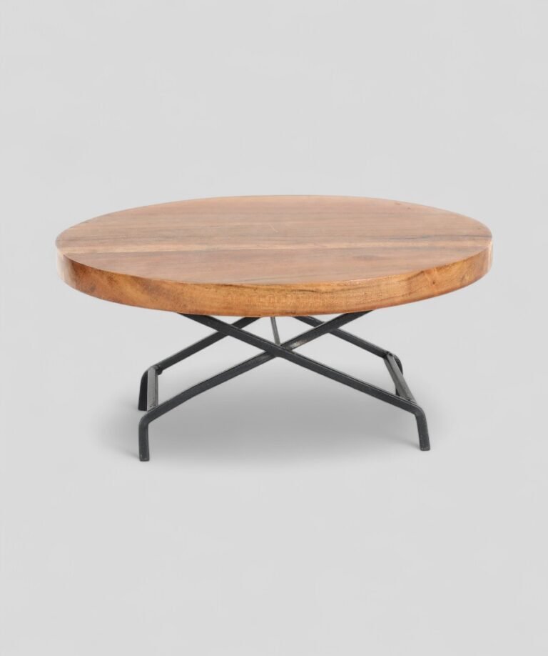 This cake stand or serving platter with a distinct industrial and rustic design. It features a thick, circular top made of natural wood with a visible grain and live edge, giving it an organic feel. The base is made of black iron, featuring a geometric, X-shaped design with four legs that elevate the wooden top.