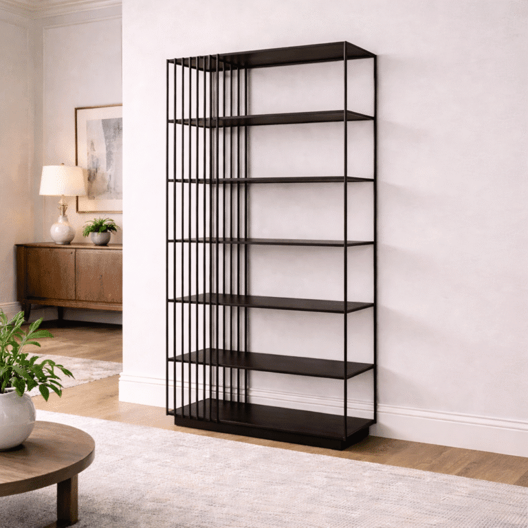 This is a sleek, modern iron bookshelf designed with a minimalist aesthetic. The vertical iron supports on the sides add a unique visual element while providing additional stability. Finished in a matte black tone, this piece blends well with contemporary, industrial, or even transitional interior styles.