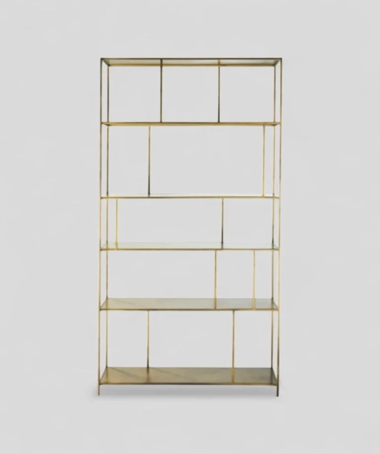 Exuding sophistication and style, this modern bookshelf is designed with a refined gold-finished metal frame that brings a touch of luxury to any space. Its thoughtfully arranged asymmetrical shelves offer a dynamic display for books, art, and decorative treasures, turning storage into an art form. The open design enhances visual space, making it an ideal choice for contemporary and minimalist interiors.