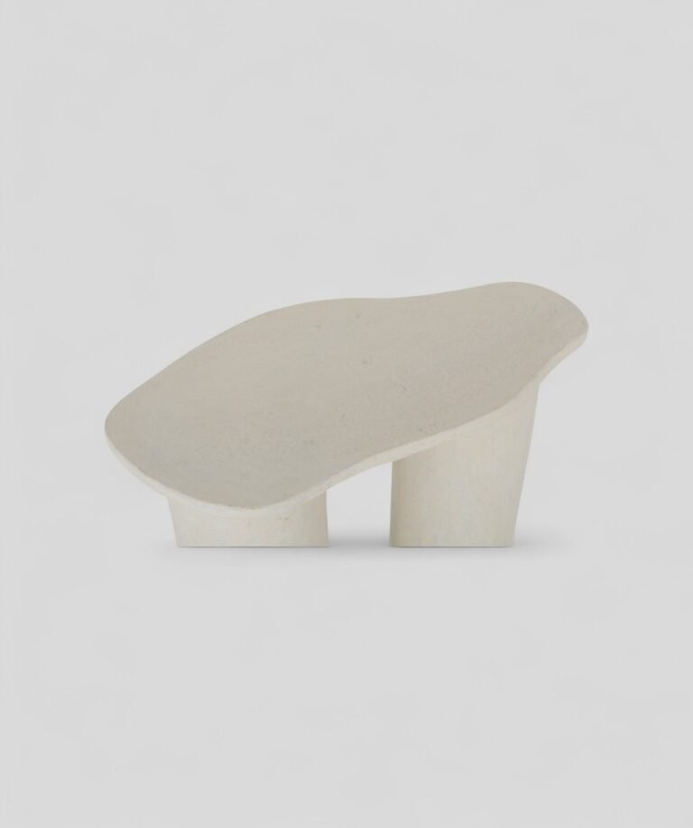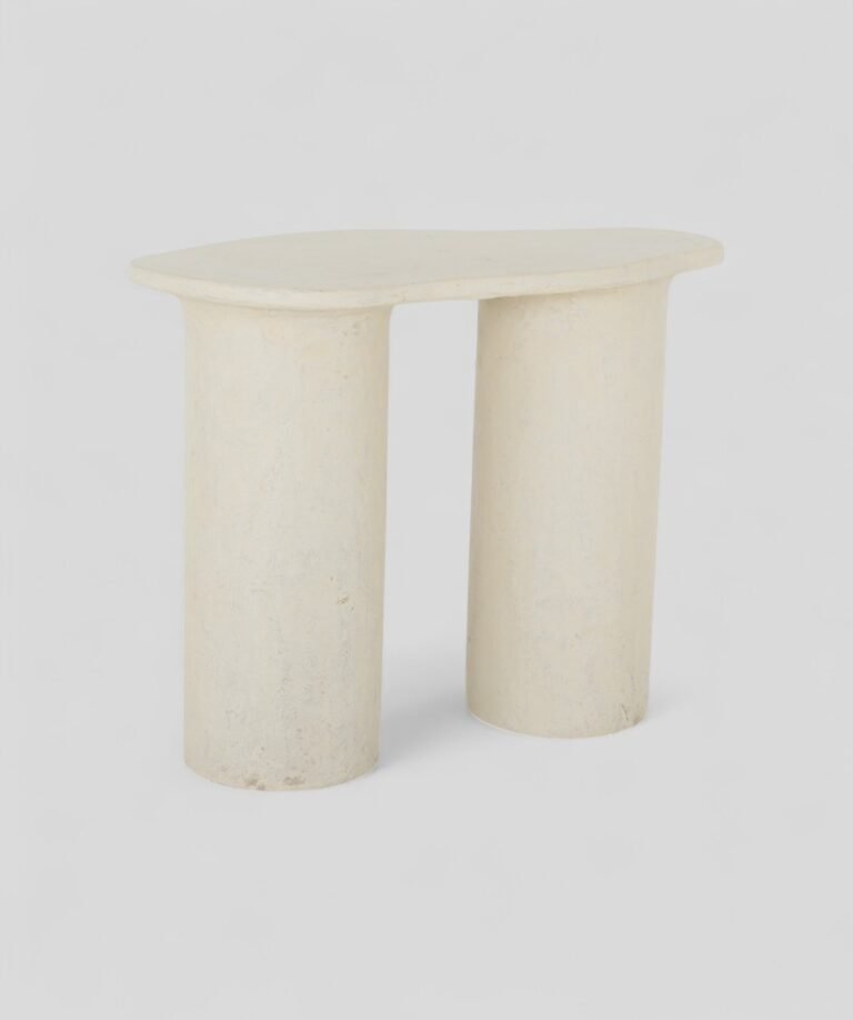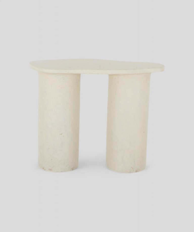Crafted from lightweight paper mâché, this side table offers an artful balance of form and function. The organically contoured top is supported by two cylindrical legs, creating a minimalist yet architectural profile. Its soft, neutral finish and gently textured surface lend a warm, handcrafted feel, making it an ideal accent for modern, rustic, or eclectic spaces. Easy to move and visually distinctive, it’s a versatile companion for any corner of the home.