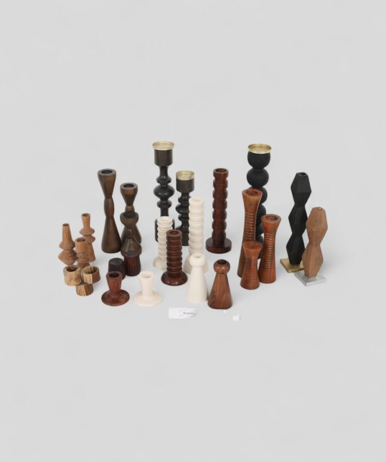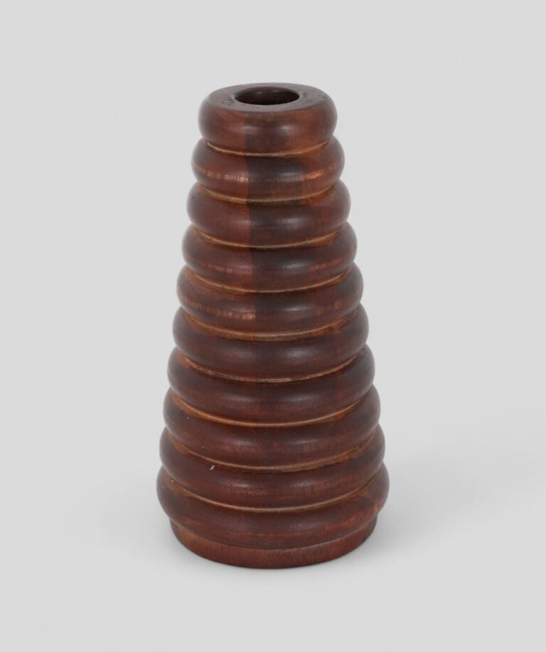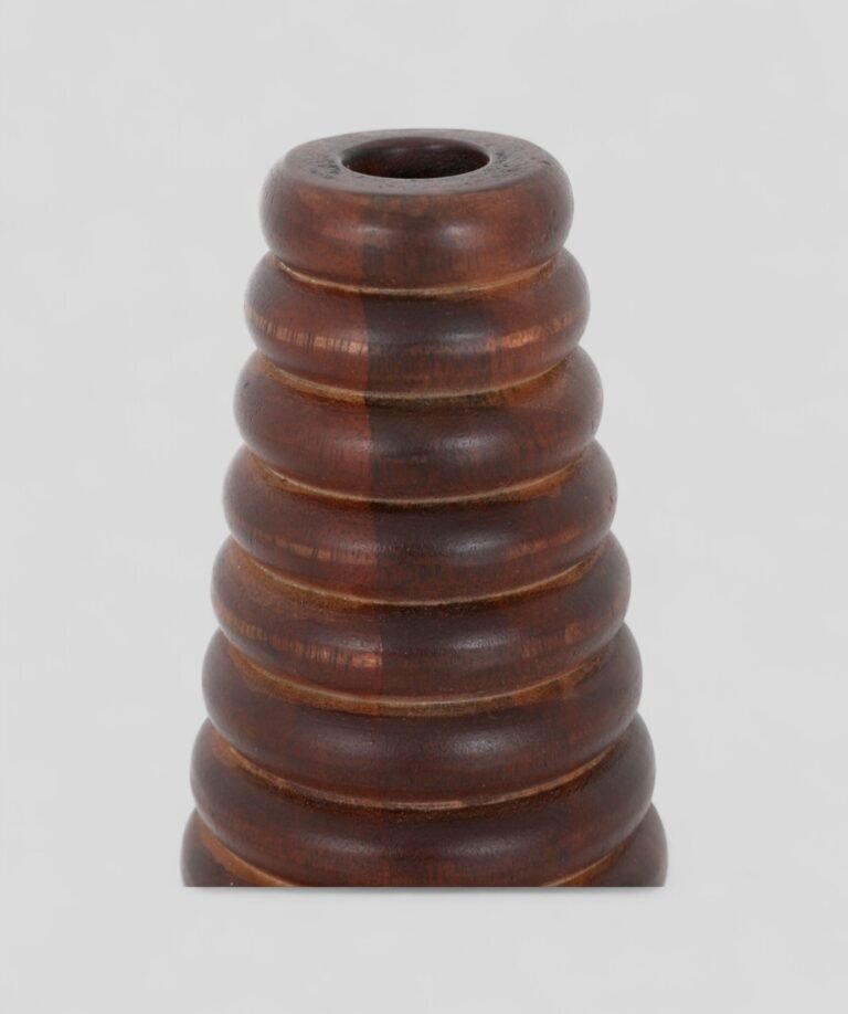 this hand-turned wooden candle stand features a unique ribbed design that draws the eye upward in a gentle taper. Crafted from richly grained wood and finished with a smooth polish, it celebrates the beauty of natural materials while offering functional elegance. The concentric ridges add both visual interest and a comfortable grip, making it as tactile as it is decorative. Perfect for holding a single candle, it brings a cosy, ambient glow to any room, blending effortlessly with rustic, bohemian, or modern interiors.