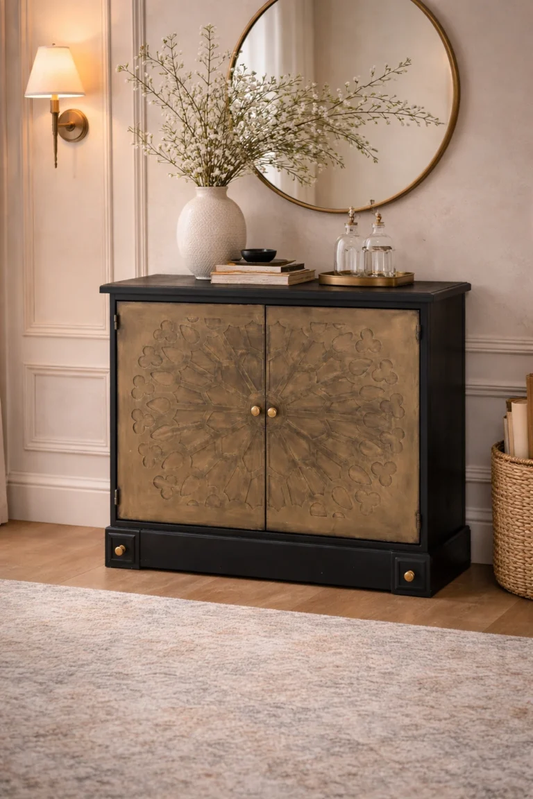 This 2-door cabinet is more than just storage—it’s a piece of art. The bold black frame contrasts beautifully with the antique brass-toned doors, which are adorned with an intricate geometric and floral-inspired pattern reminiscent of timeless architecture. With compact proportions and elegant detailing, it serves as both a functional storage solution and a decorative accent for living rooms, hallways, or dining spaces.