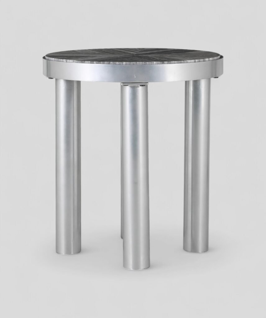 Handcrafted Iron and Glass Accent Table The table features a semi-cylindrical iron base, finished in a matte black tone that evokes strength and structure. This solid metal form is partially encased by reclaimed, dark-stained wood planks, adding warmth and natural texture to contrast the industrial steel. The wood retains visible imperfections, bolt holes, and grain lines Celebrating the authenticity of salvaged materials.