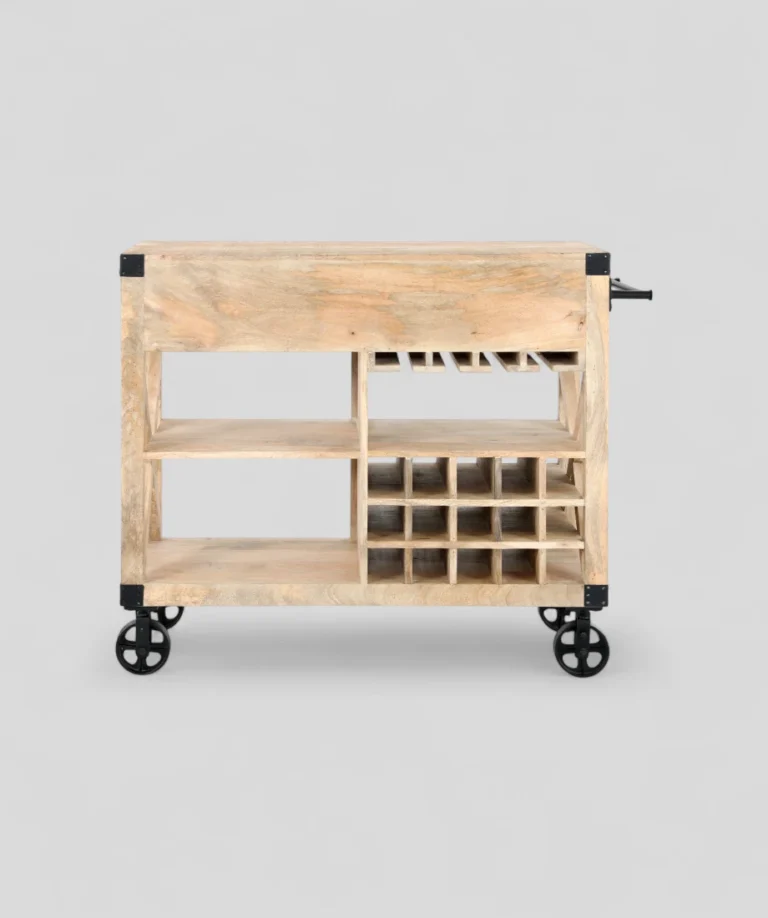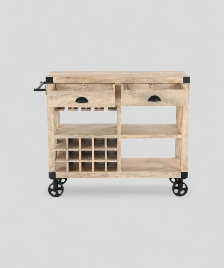 This rustic wooden trolley combines timeless craftsmanship with practical utility, making it a versatile addition to any space. Constructed from natural wood with a light, raw finish, the trolley features two spacious drawers with black cup handles, a dedicated wine rack, a glass holder, and multiple open shelves for ample storage. The robust iron wheels add an industrial touch while ensuring easy mobility. Whether used as a bar cart, kitchen organizer, or serving station, this trolley brings both style and convenience to your home.