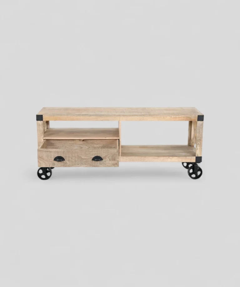 Rustic Industrial Wooden TV - This bar trolley is a striking blend of rustic charm and industrial functionality. Crafted from solid mango wood with iron wheels, its surface showcases the organic grain and texture of the material, adding warmth and character to any space.