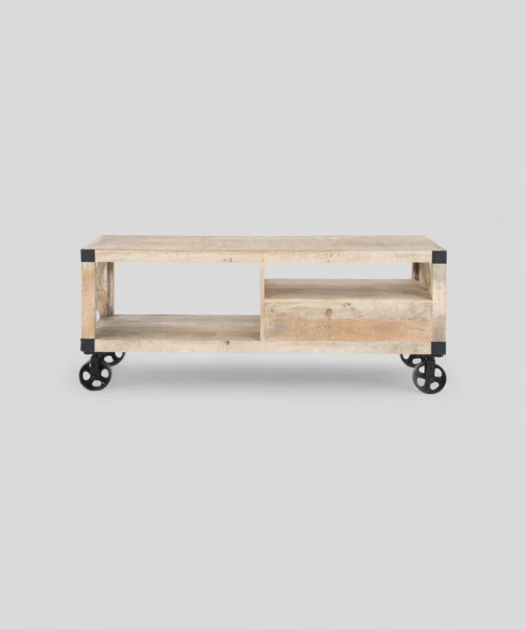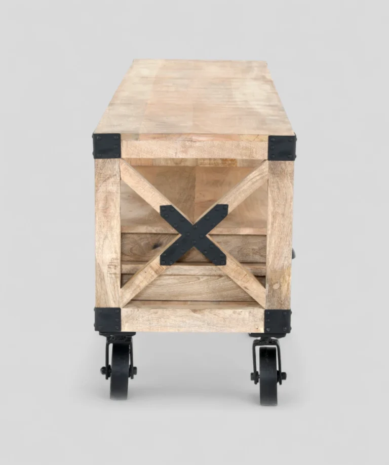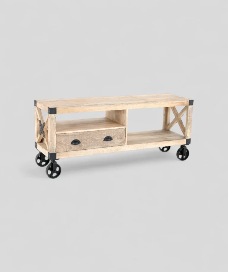 Crafted from natural wood with a light, weathered finish, this TV unit blends rustic charm with industrial flair. The sturdy black metal corner brackets and X-frame side detailing add a bold touch, while the smooth-rolling castor wheels provide easy mobility. Featuring open shelves for media devices and a central drawer with sleek black handles, it offers both storage and display space. Perfect for living rooms seeking a functional yet stylish centrepiece, this piece brings warmth, durability, and character to any home.