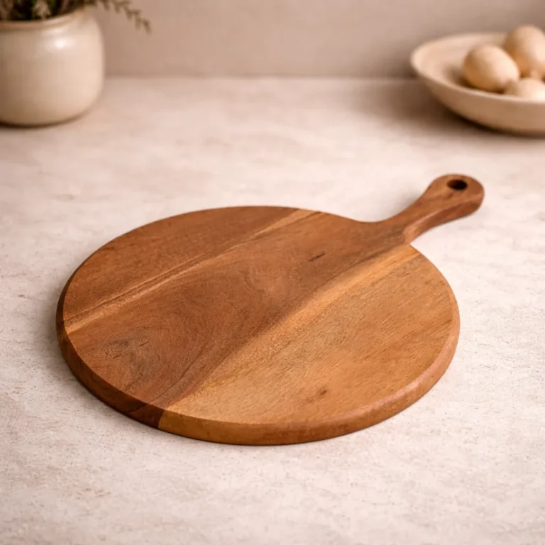 This is a round wooden chopping board or serving platter. It is made from a single piece of wood, likely acacia or mango wood, and features a prominent, natural grain.