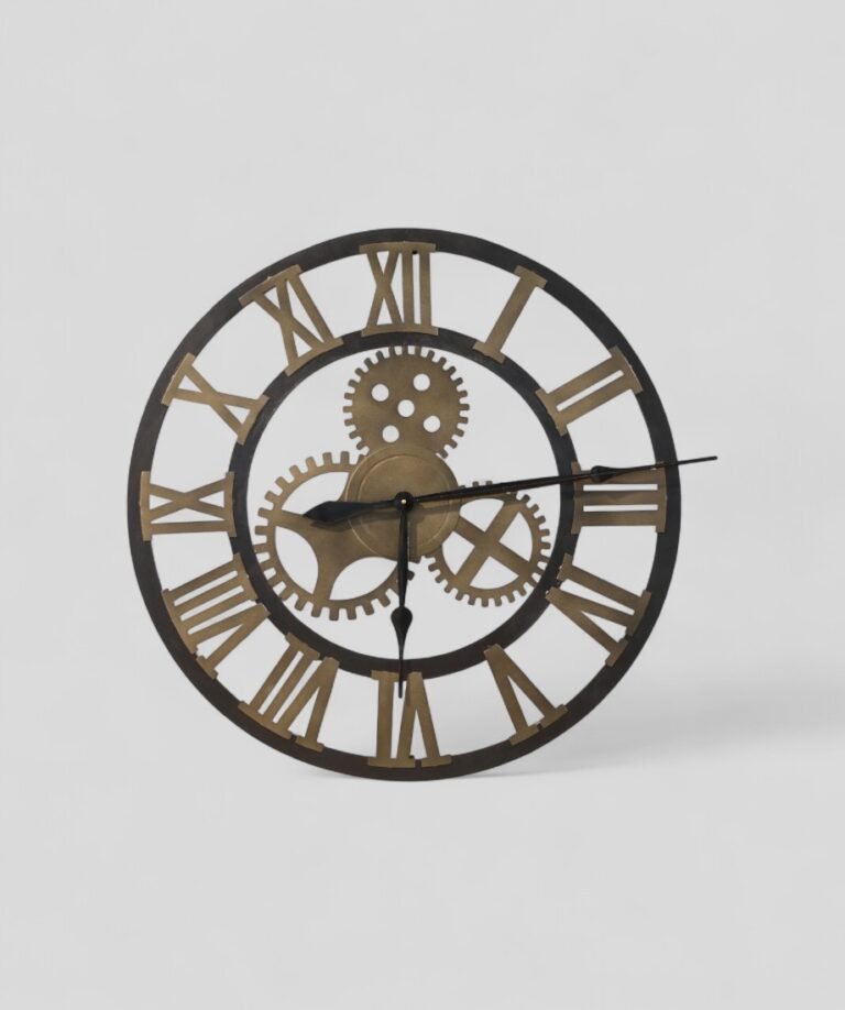 This striking wall clock combines industrial charm with timeless elegance. Crafted with an open-frame design, it features intricately detailed gear accents at the centre, creating a captivating focal point. The bold Roman numerals are finished in a rich golden hue, offering a beautiful contrast against the dark metal frame. Sleek black hands sweep across the face, ensuring easy readability while maintaining the clocks vintage-inspired aesthetic. Perfect for adding a touch of sophistication and character to living rooms, offices, or entryways.