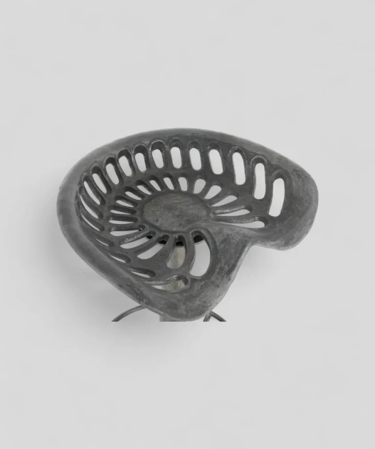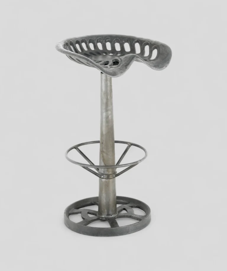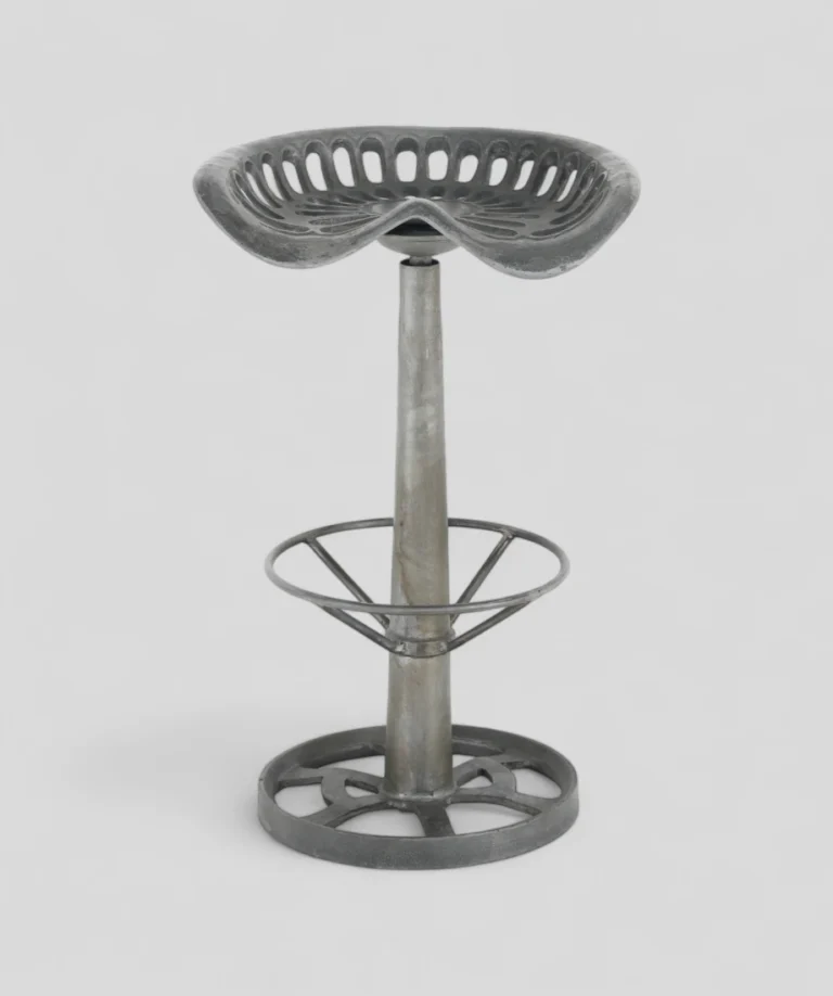 This iron stool showcases a distinctive industrial design inspired by vintage tractor seats. The contoured seat features a series of elongated oval cut-outs, providing both ventilation and a classic rustic aesthetic. Crafted entirely from iron, the stool has a durable and sturdy build, with a weathered metal finish that enhances its rugged character. The seat is supported by a single, robust cylindrical pedestal that tapers slightly toward the base, contributing to the stools minimalist yet functional form. Approximately midway down, a circular footrest ring is securely welded to the pedestal, offering comfort and support for seated users.