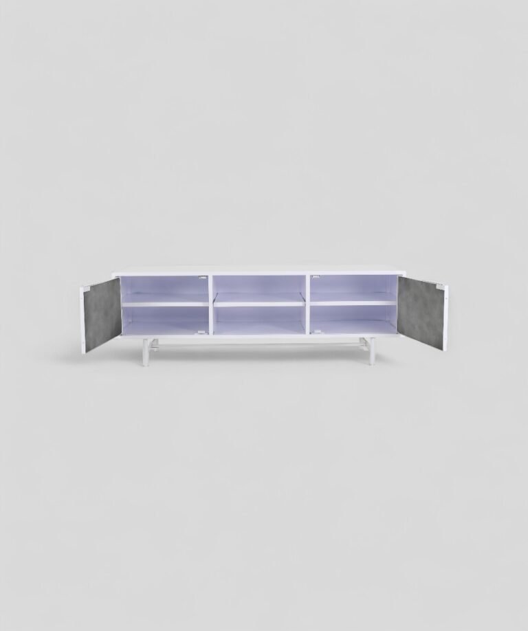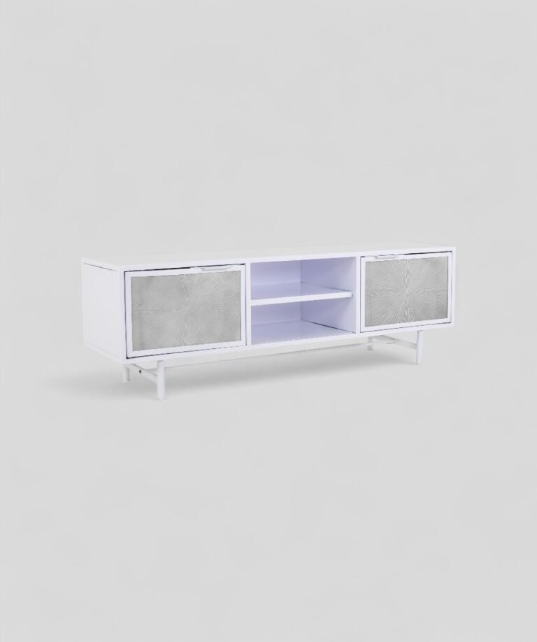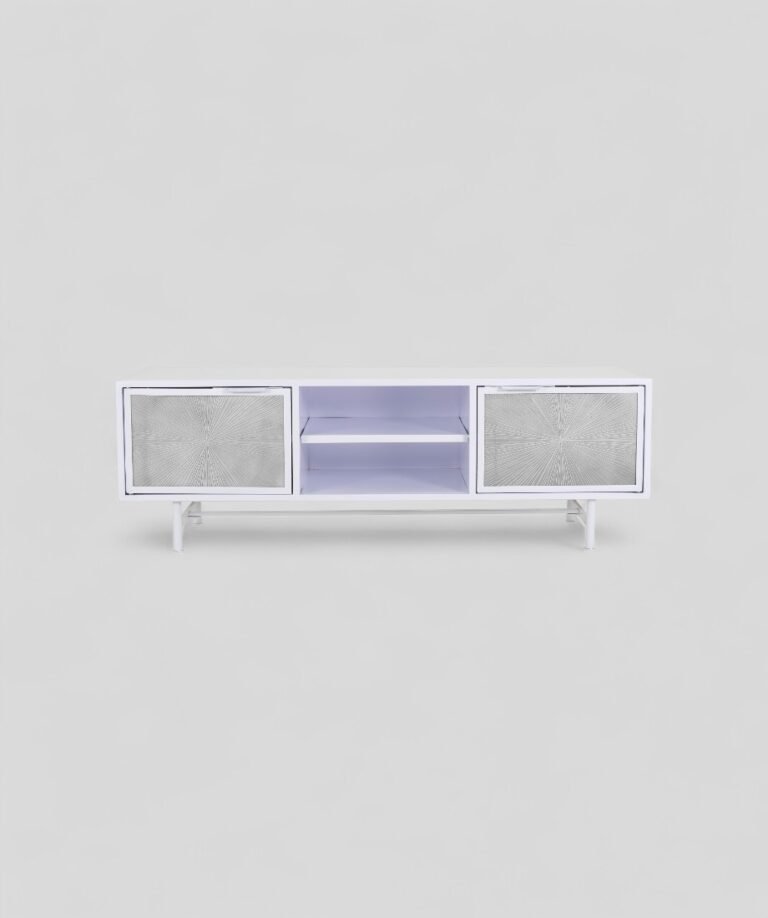 The Veneer Bloc Media Console gets its name from its solid, geometric form. Its body is a seamless block, supported by a minimalist metal frame that gives it a subtle, floating appearance. The defining feature is the pair of sun-ray veneered doors. Crafted from carefully selected wood veneer, each door front features a dynamic starburst pattern that radiates outwards from the center, creating a stunning visual texture. This intricate detail adds a layer of depth and artistry, catching the light and bringing a unique, luminous quality to the piece.