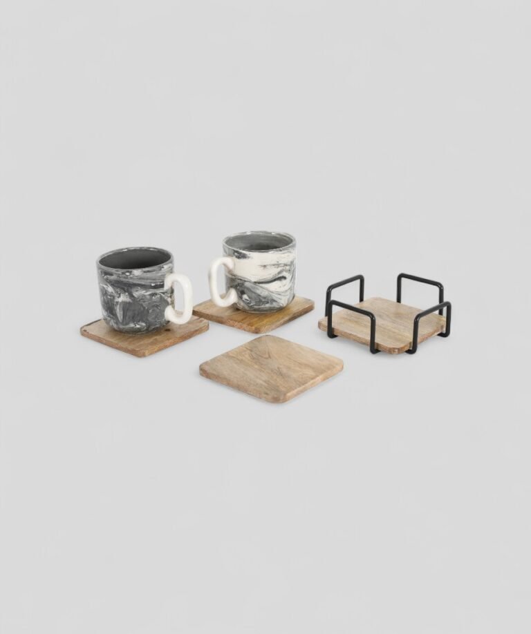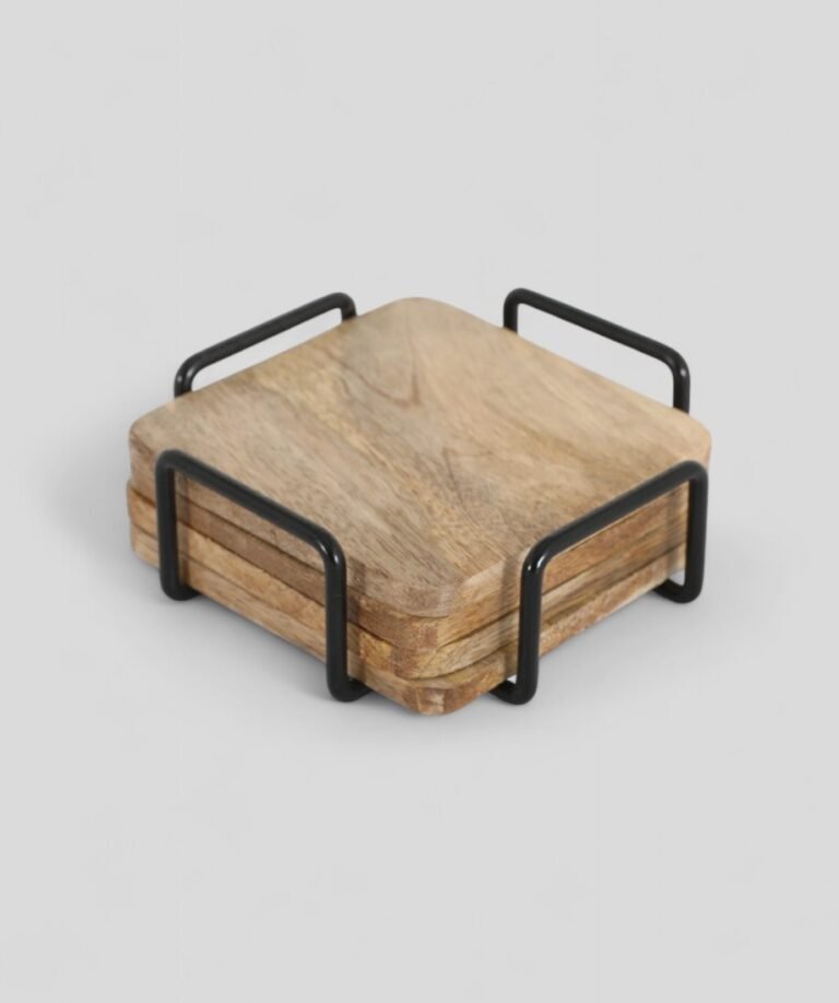 Keep your table stain-free with these natural wooden set of 4 coasters, designed with a minimalist black stand for organized storage.