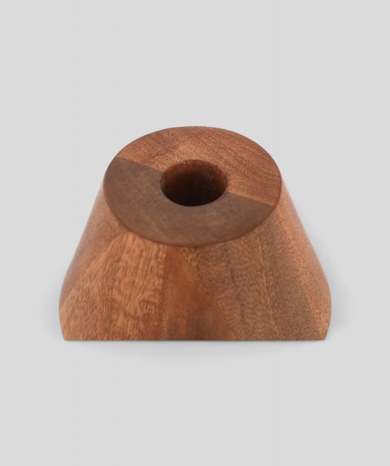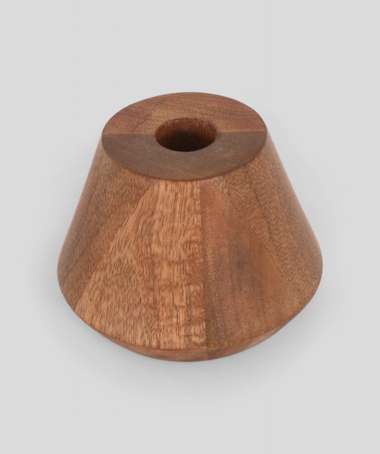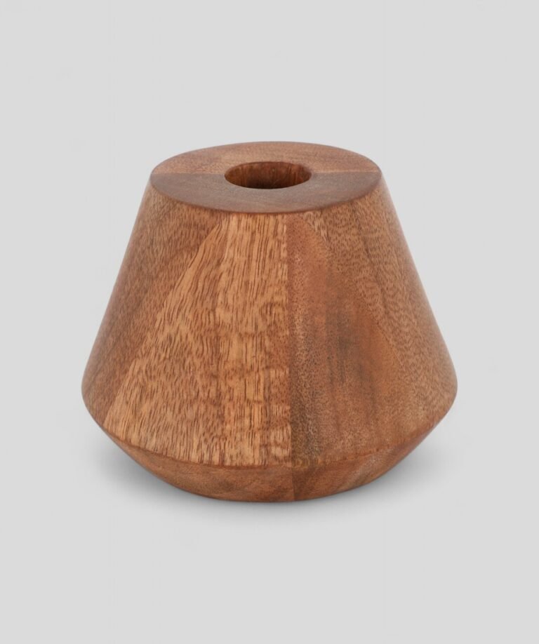 Crafted from rich, warm-toned mango wood, this candle stand blends minimalism with natural beauty. Its geometric conical shape adds a modern twist, while the smooth hand-polished surface highlights the unique wood grain patterns. Designed to hold a single taper candle, it provides a stable base and a refined look, making it a perfect accent for dining tables, mantels, or cozy corners.